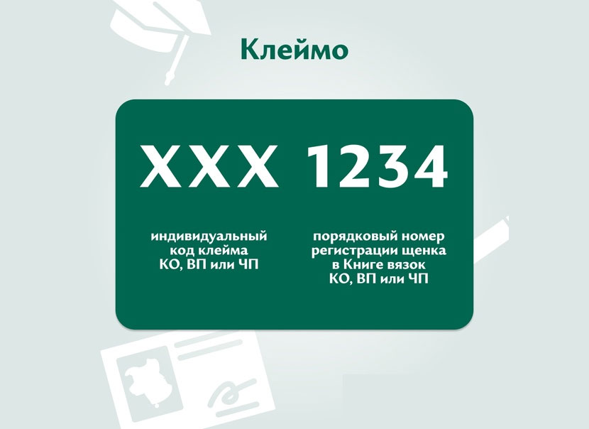 Клеймо РКФ – это буквенно-цифровой код, буквенная часть которого указывает, в каком именно питомнике появилась на свет собака, а цифровая часть представлять собой порядковый номер щенка, зафиксированный в племенной книге питомника.